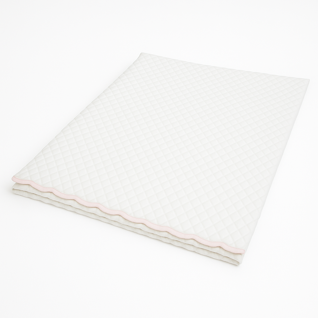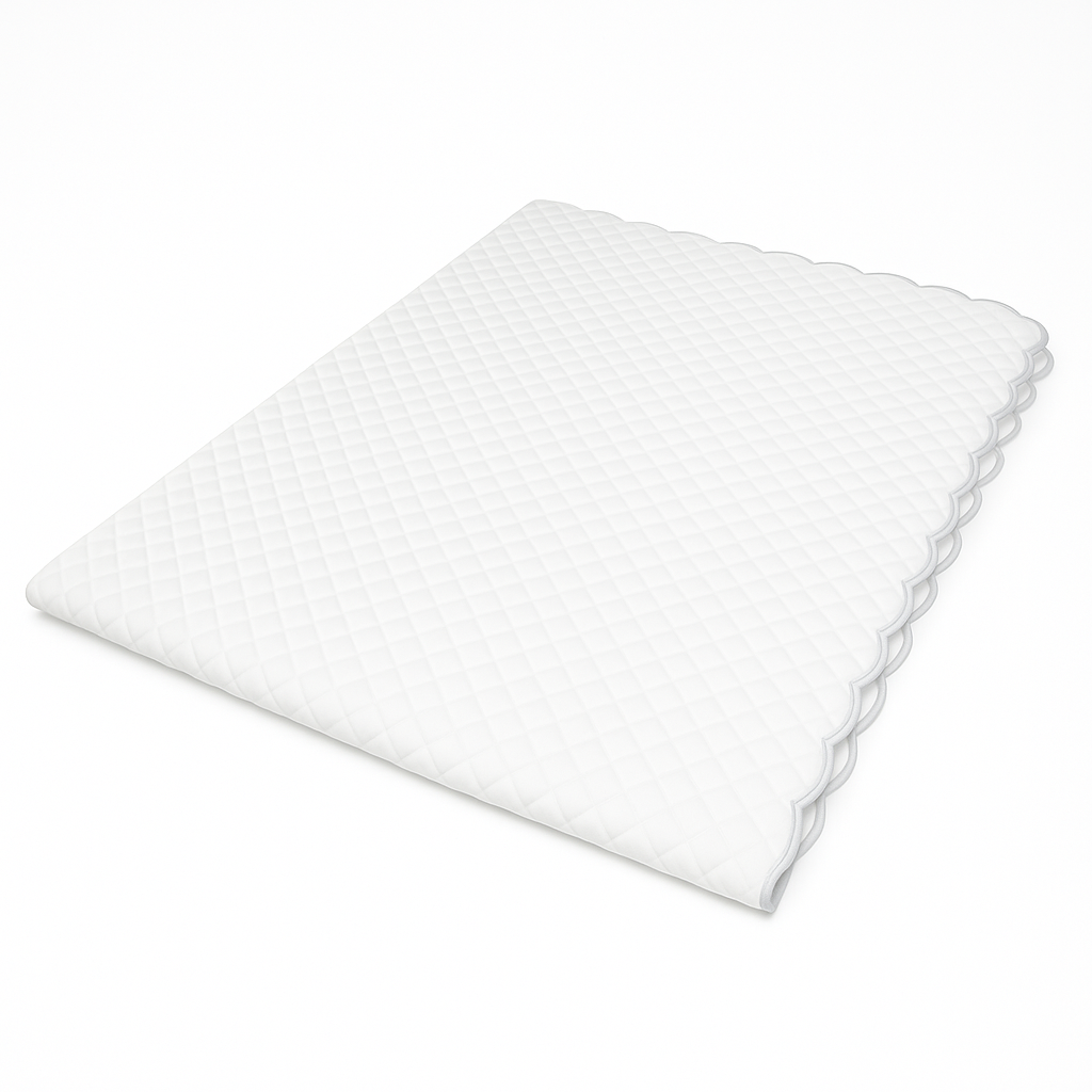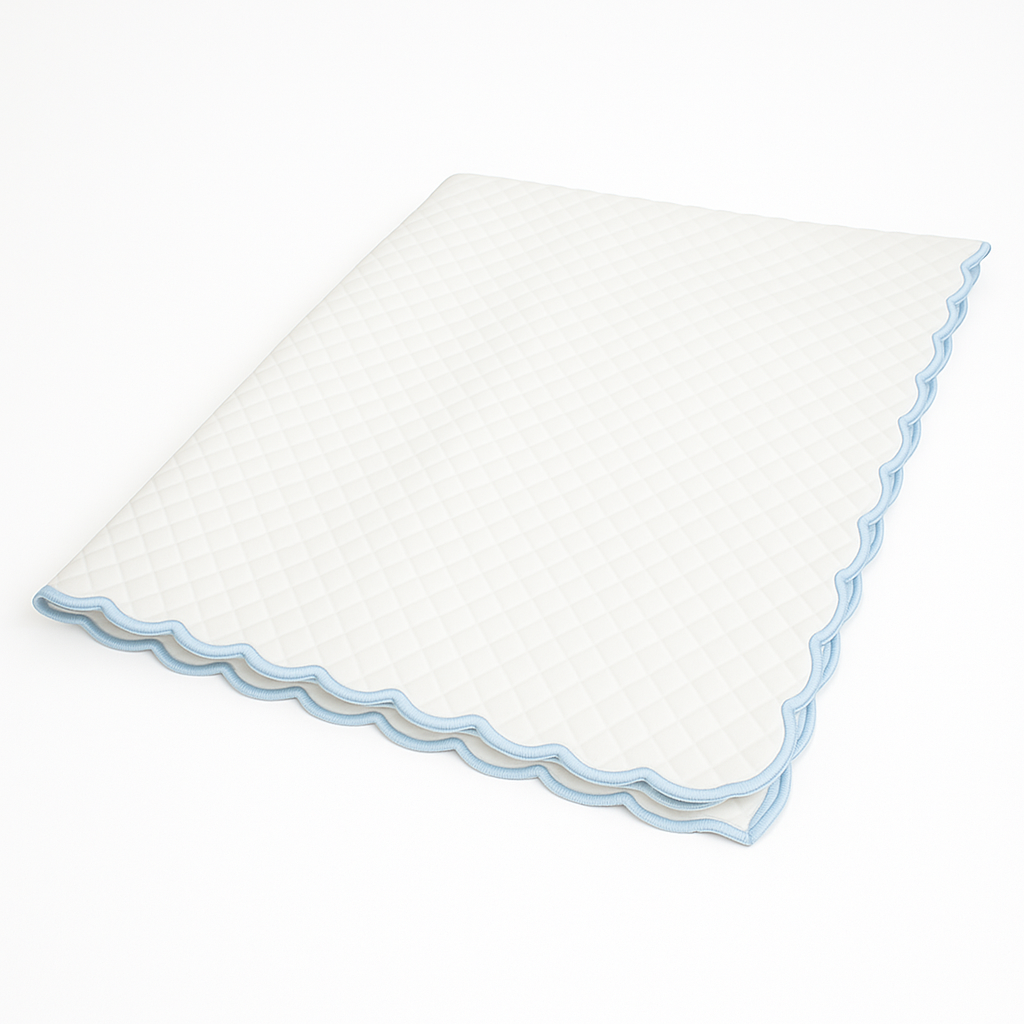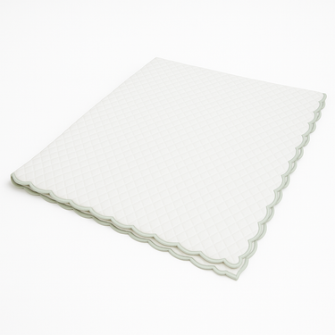 Our scallop coverlets, made from 100% Egyptian king staple mercerized sateen cotton, bring a soft, luxurious touch to your baby’s crib. Featuring elegant scallop trims in colors like celadon green and blue, they add a refined accent to any nursery. Made in Italy, these coverlets are designed for gentle care—hand wash cold, air dry.